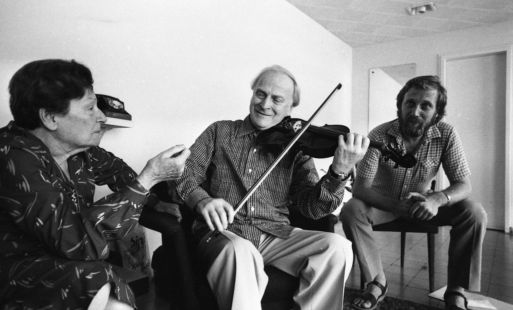 Sir Yehudi Menuhin (center), pictured during a break from a violin lesson and masterclass